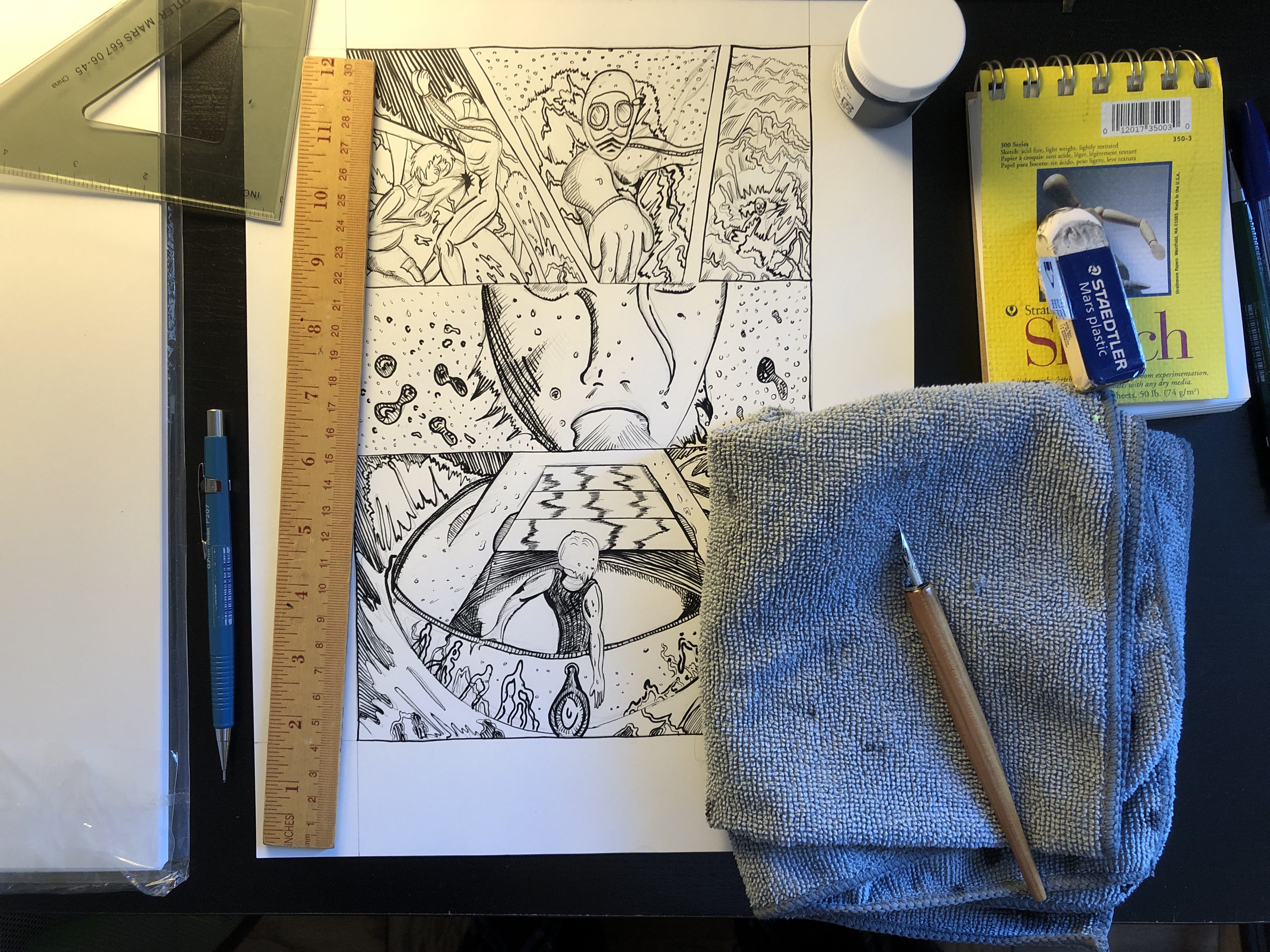 Though I never pursued the school, that interaction left me feeling some validation. I had spent day after day crafting an apocalyptic graphic novel, replete with grotesque scenes of violence, harrowing escapes, and pages of city landscape submerged in water. Since I started working on this project, I dreamed of it appearing on bookstore shelves in some form or another. I tried writing a novel version of the story. Admittedly, it wasn’t as good as my pencil-drawn graphic novel that I wrote in the summer between my junior and senior year of high school. Writing out the sprawling saga that I called Masked in Bones did help me explore the rules of my world and develop my characters. That being said, I knew from the beginning that I wanted to tell this story in the graphic form. While living in Japan, I bought mangaka art supplies, flipped through my my little notebook, and began redoing the panels with a nib pen and black ink.